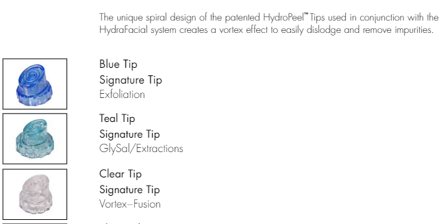 The spiral design of the HydroPeel tip, used in conjunction with HydraFacial's proprietary vacuum technology and serums, creates a vortex effect that easily removes and eliminates impurities while providing a moisturizing skin solution.